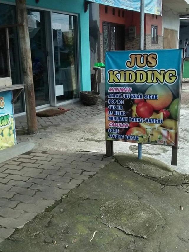 See? Tulisan headline pada spanduk berupa Jus Kidding ini sangatlah kreatif. Sebab memparodikan kata “just” dari Bahasa inggris, lalu mengelaborasinya sebagai sebuah merek dagang.